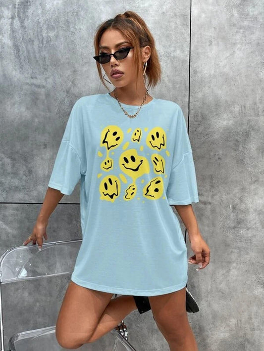 Popster sky blue Printed Cotton Round Neck oversized Fit Half Sleeve Womens T-Shirt