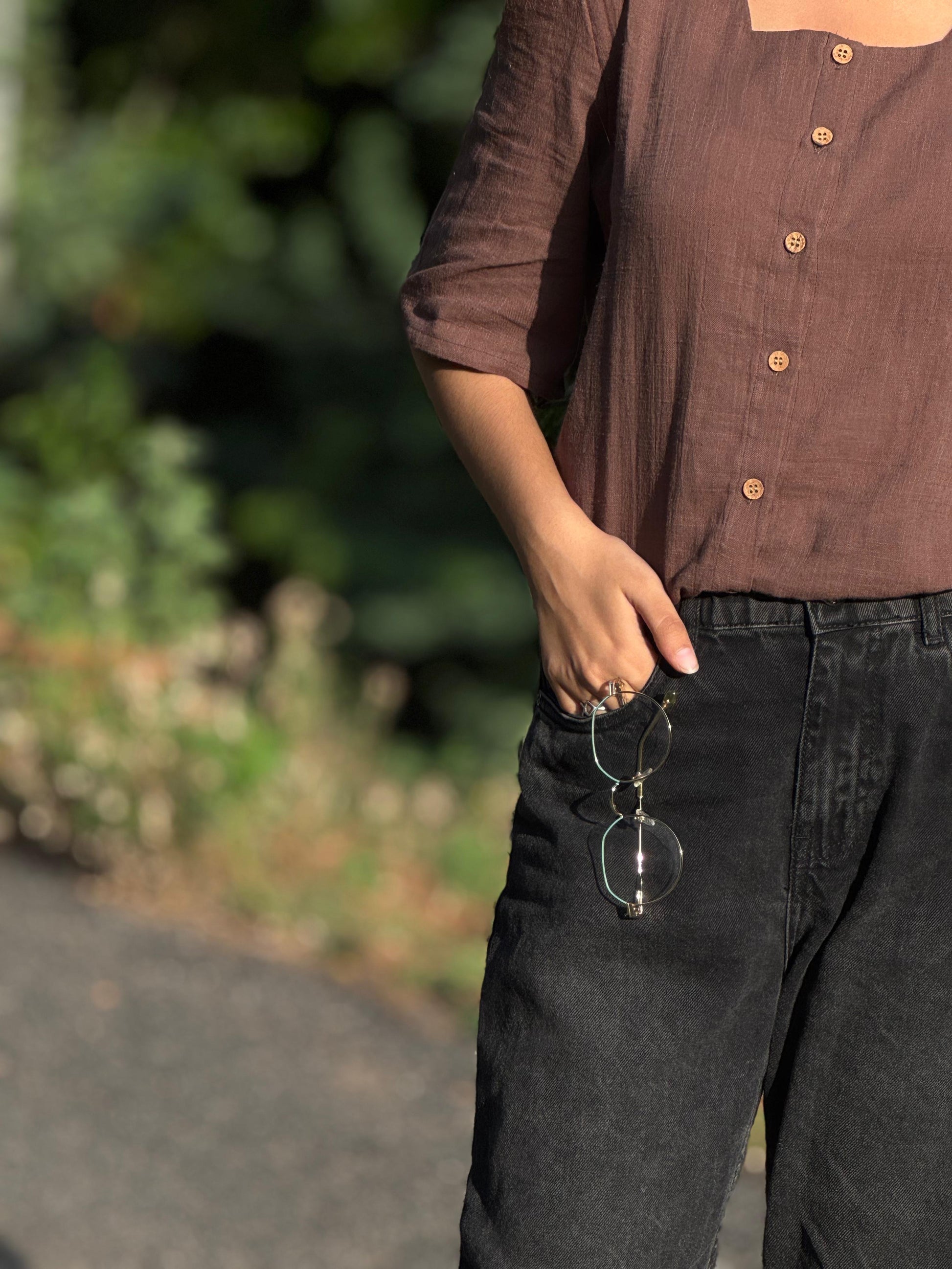 Designed for effortless everyday style, this crop top is crafted from a breathable linen-cotton blend that keeps you cool and comfortable. The open-front style features natural wooden buttons for a rustic touch, while the mini puff sleeves add a subtle hint of volume and charm. An elasticated hem around the hips ensures a snug, flattering fit that stays in place without clinging. This easygoing yet feminine top is perfect for pairing with high-waisted pants, shorts, or skirts for a balanced, chic look.