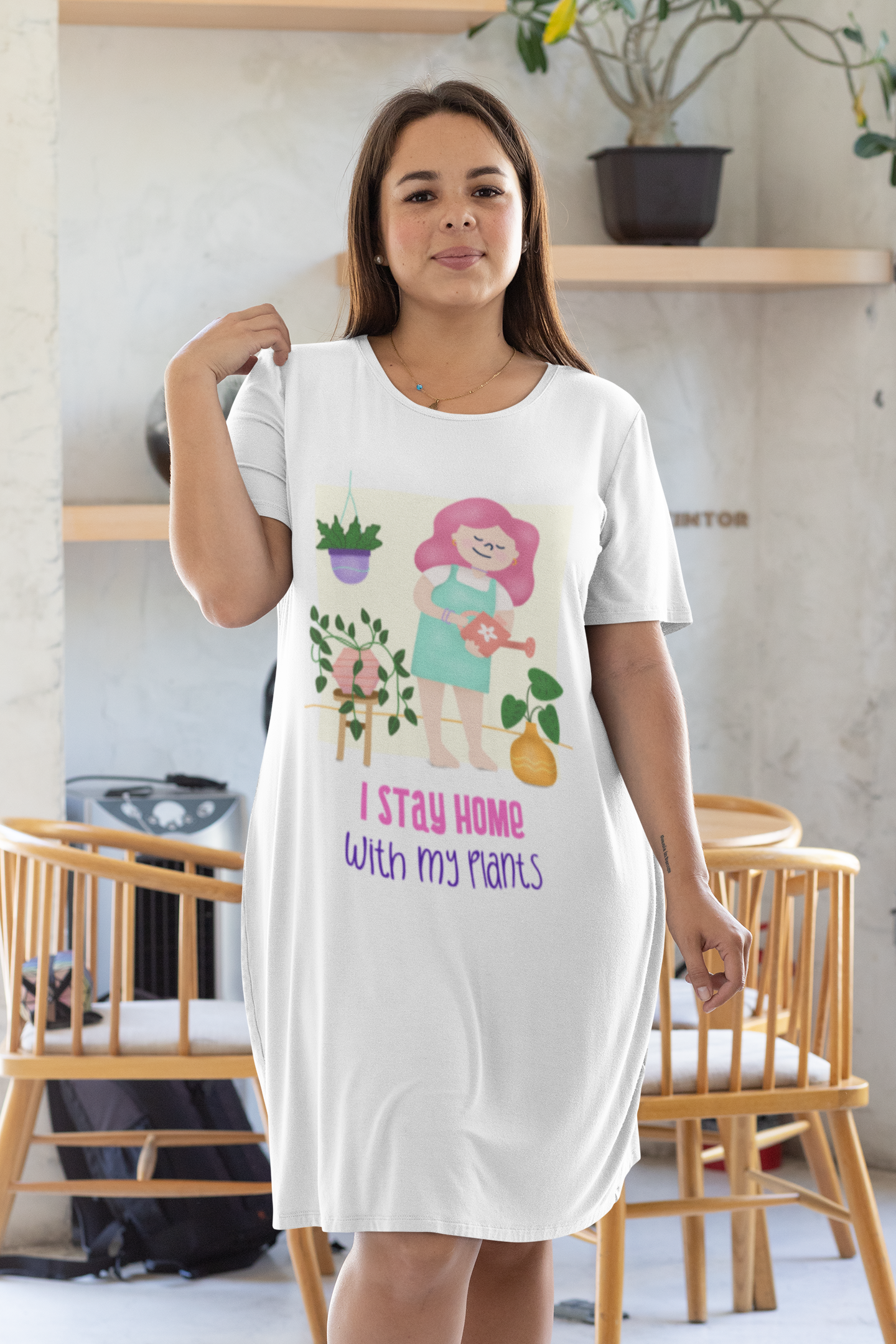 I Stay Home With My Plants Printed White T-shirt Dress